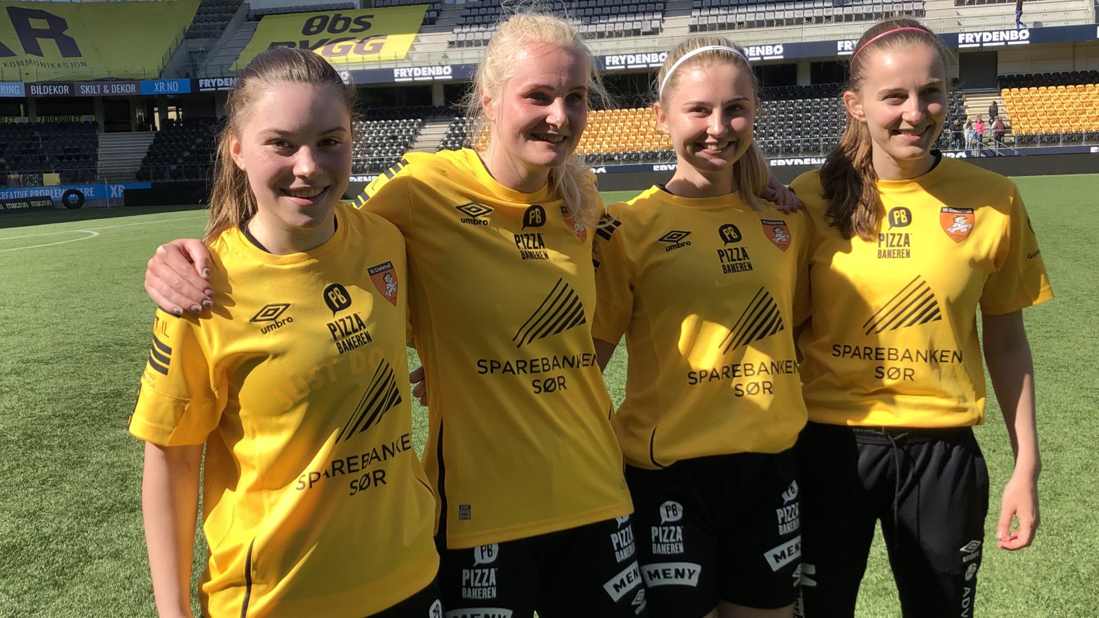 Elise Ånensen Vindheim (t.v.), Frida Abrahamsen, June Tønnesland Johansen og Isabella Hayes Sundby scoret målene da Gimletroll vartet opp med festspill og hentet hjem sesongens første trepoenger med 4-1-seier over GØIF/Helgerød på Sparebanken Sør Arena lørdag ettermiddag. (Foto: Seunn Smith-Tønnessen).