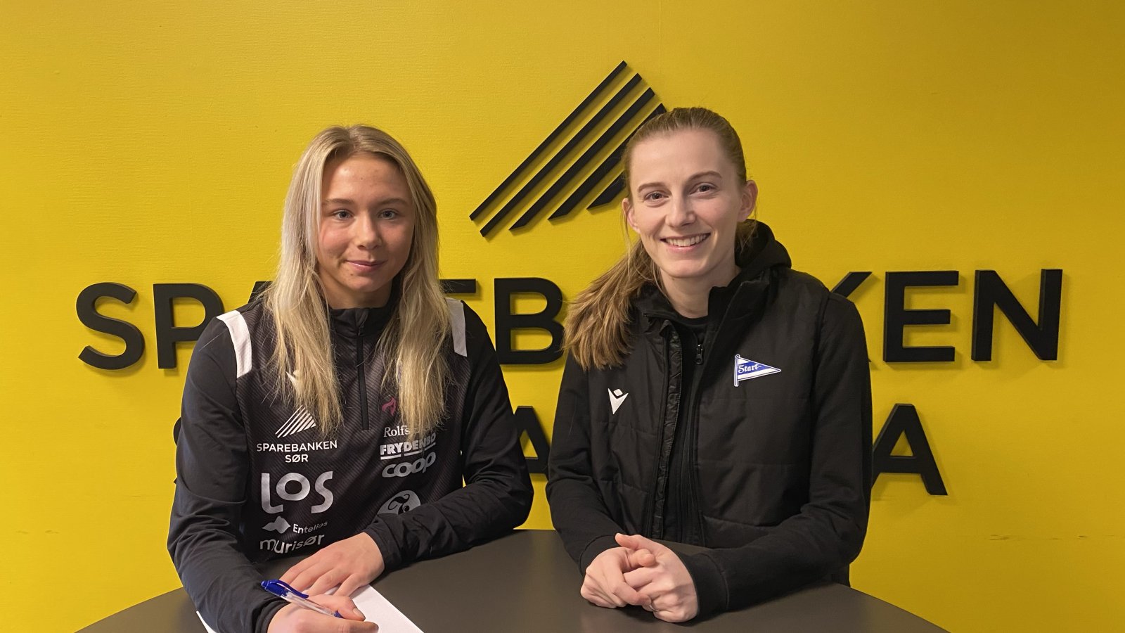 Her signerer Ina Andresen (t.v.) kontrakten som gjør henne til Start-spiller i 2023-sesongen. Trener Isabella Hayes Sundby (t.h.) er strålende fornøyd med at 18-åringen blir med henne videre. (Foto: Egil Olsen)