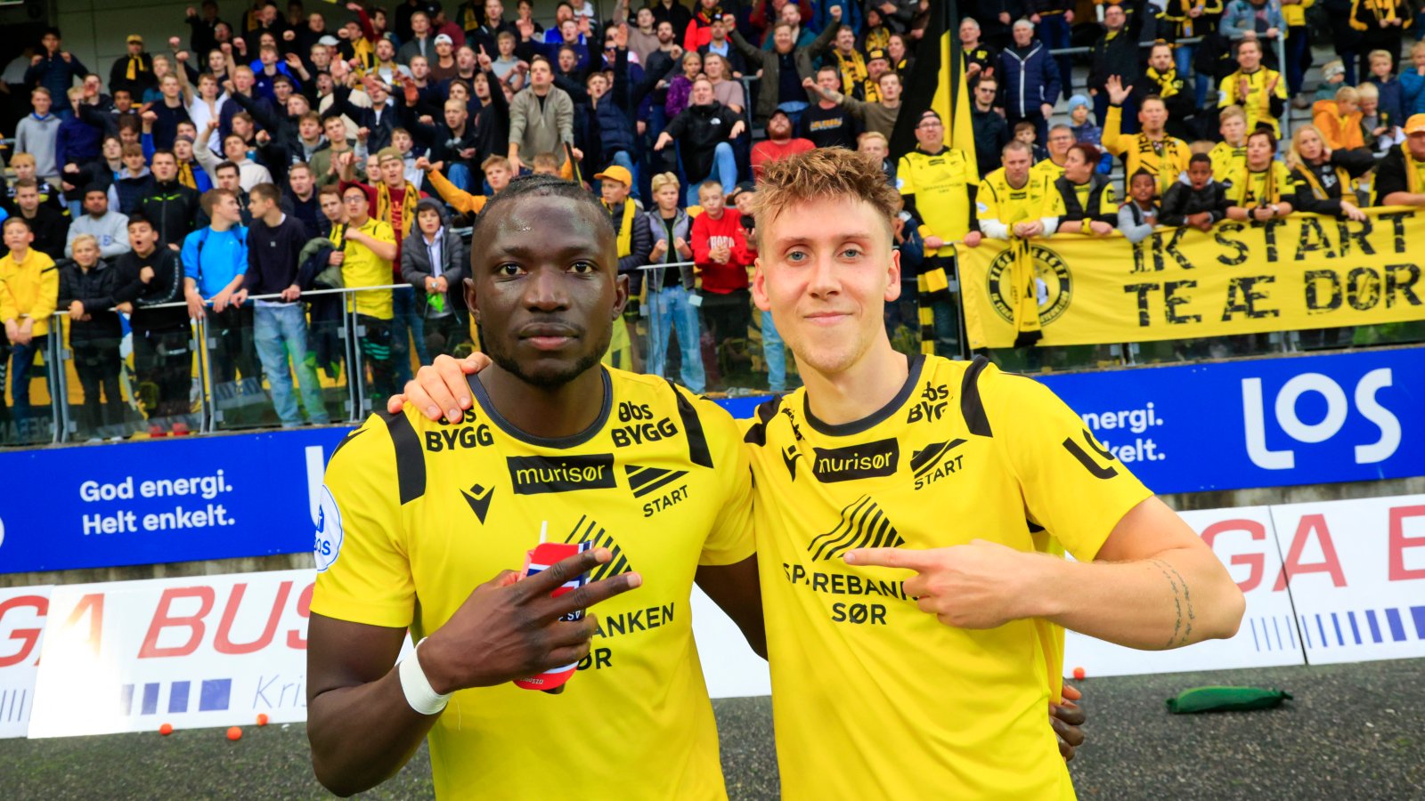Bjarni Mark Antonsson (t.h.) og Alagie Sanyang scoret målene da Start slo Ranheim 2-1 lørdag ettermiddag. Seieren var Starts sjuende strake på eget gress, og sikret oss den viktige tredjeplassen i OBOS-ligaen.
