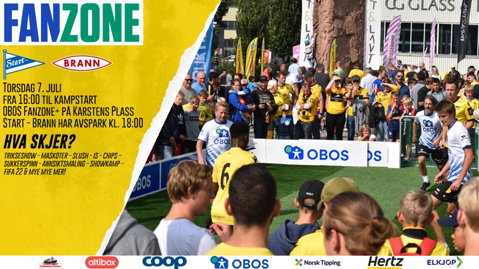 Torsdag 7. juli fra kl. 16:00 og frem til kampstart vil det være rigget til OBOS Fanzone+ på Karstens Plass. Her vil det være massevis av gratis aktiviteter som alle kan ta del av. Det vil bli delt ut mengder med premier og gaver til de som møter opp.