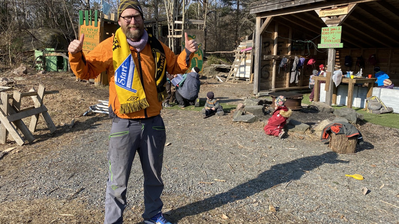 Her i Marvika, på tur med barna i Roligheden gård barnehage, lader Tigerbergets leder, Kai Rune Karlsen (45), opp til lørdagens cupbatalje mellom Sandnes Ulf og Start på Øster Hus Arena. (Foto: Egil Olsen).