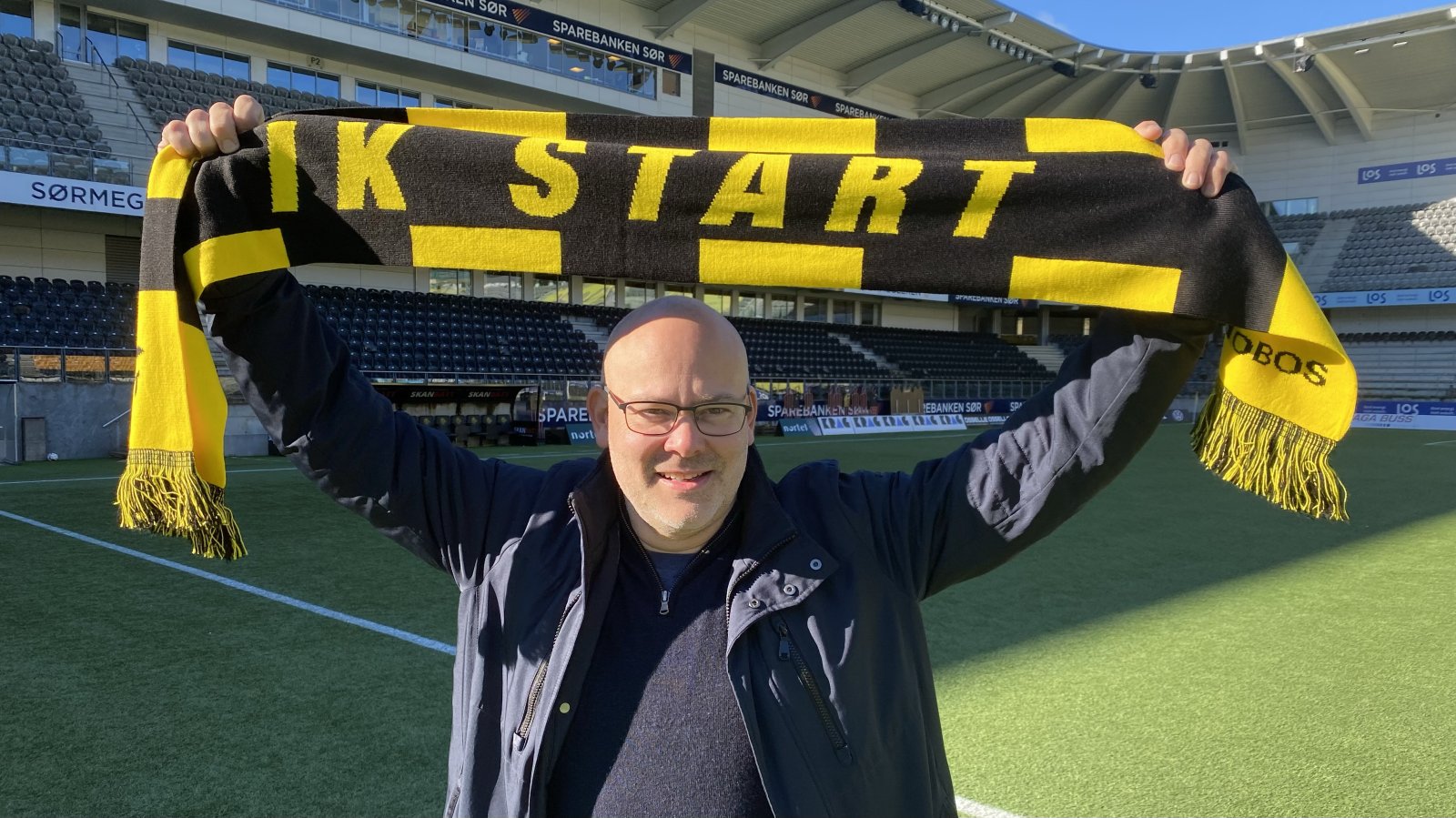 Sveinung Hedding-Valvik ble på fredagens sponsor-frokost på LOS presentert som ny kommersiell leder i Start. Her er den ihuga Start-supporteren fotografert på Sparebanken Sør Arena, hans nye arbeidsplass fra 1. november. (Foto: Egil Olsen).