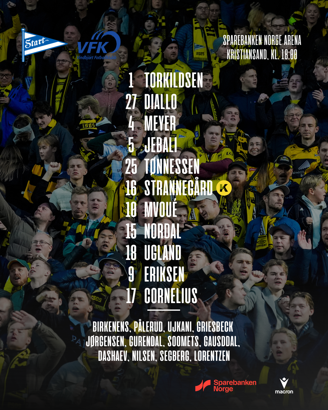 På benken har vi: Dennis Birkenes (Ke), Fredrik Pålerud, Altin Ujkani, Sebastian Griesbeck, Deni Dashaev, Alexander Gurendal, Håkon Lorentzen, Markus Soomets, Adrian Nilsen, Sondre Jørgensen, Erlend Segberg og Lukas Gausdal.