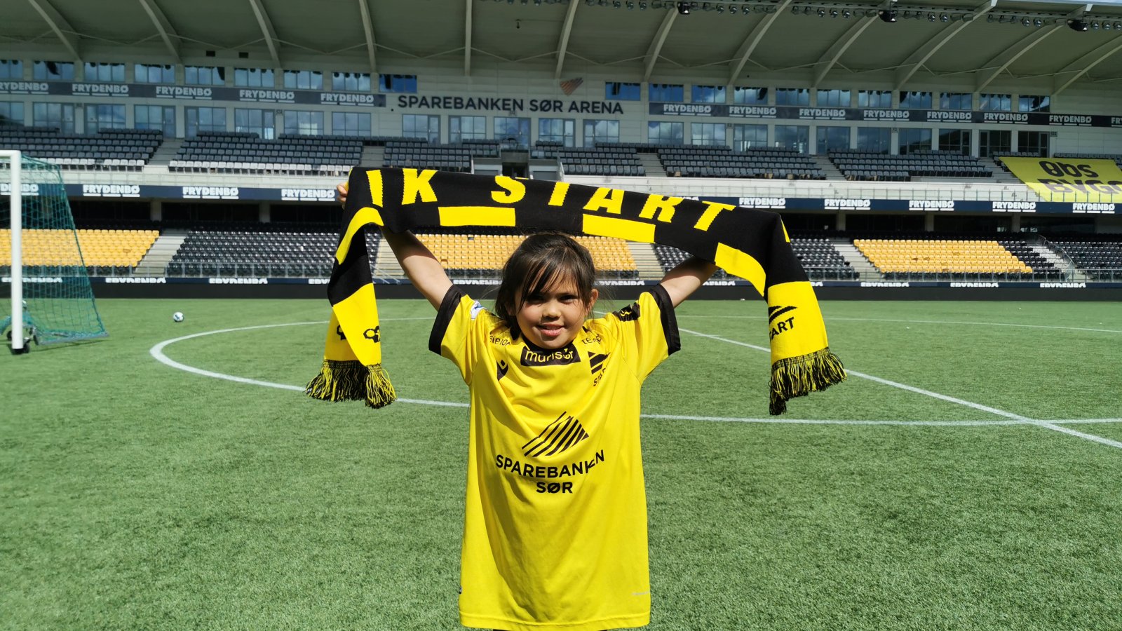 Åtte år gamle Kayla fra Bergen er en vaskeekte Start-fan – fredag fikk hun sitt første besøk på Sparebanken Sør Arena. Foto: Egil Imenes