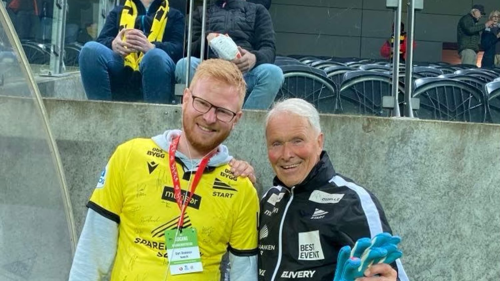 Daniel Hillestad er ikke «bare» en look-alike av Ed Sheeran. Han har også en stemme som kan forveksles med den britiske verdensstjernens. Torsdag synger ivedølen Start-hymnen på Sparebanken Sør Arena igjen. Her er han avbildet med keeperlegenden Erik Ruthford Pedersen.