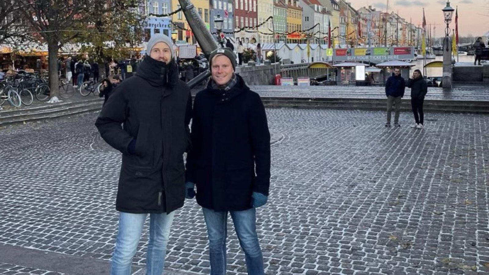Eirik Schulze (t.h.) sammen med tidligere lagkamerat Henrik Gjesdal i vakre Nyhavn i København. (Foto: Privat)