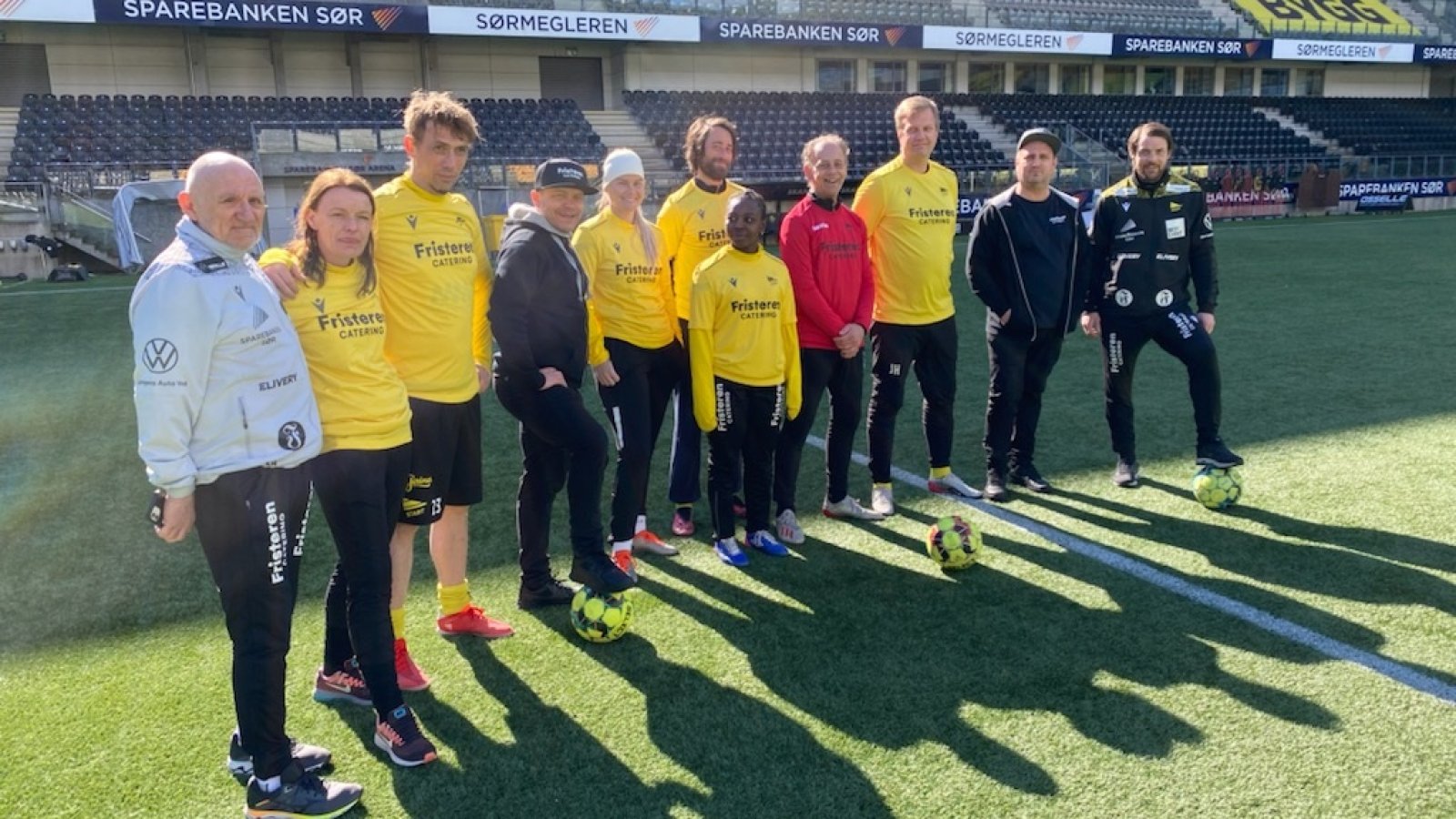 Hos Fristeren Catering på Sparebanken Sør Arena er de ikke «bare» gode på mat, de er også gode mot mennesker som sliter. Det er blant annet derfor de støtter Starts Gatelag. (På bildet er en del av Gatelags-spillerne sammen med Per-Erik Andersen (Start - t.v.), Henning Kristiansen (Fristeren - nr. 4 f.v.), Tor André Fidjestad (Fristeren - nr. 2 f.h.) og Espen Børufsen (Start - t.h.). Foto: Egil Olsen.)