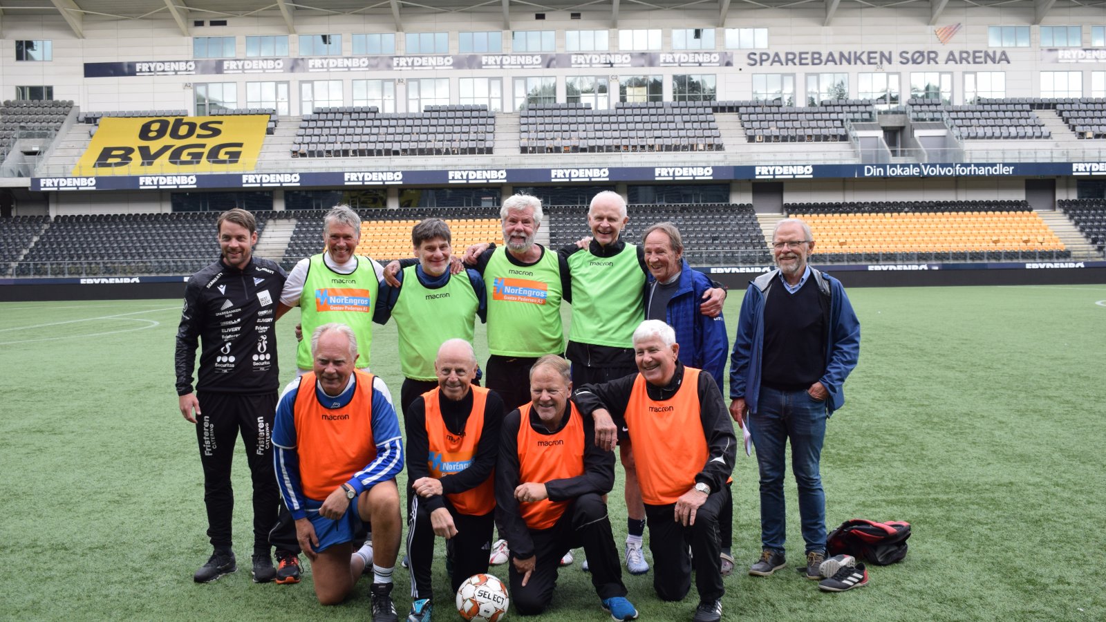 Gåfotball-gjengen har trening hver mandag på Sparebanken Sør Arena. Her er spillerene samlet med Start-legendene Espen Børufsen og Trond Pedersen.