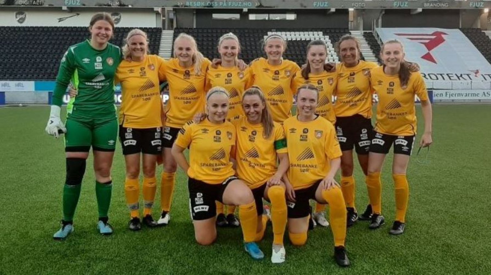Lørdag kl. 14.00 spiller blant andre disse Gimletroll-jentene for første gang i gult og svart på Sparebanken Sør Arena: Bak f.v.: Juliane Pettersen, Erica Nystøl, Frida Abrahamsen, June Tønnesland Johansen, Karoline Fredriksen, Elise Ånensen Vindheim, Marie Forsøget Knutsen, Isabella Hayes Sundby. Foran f.v.: Karianne Haslekås Knudsen, Linn Christine Farbergshagen og Eirin Noem Korsvik. (Foto: Thor Ø. Rustad).