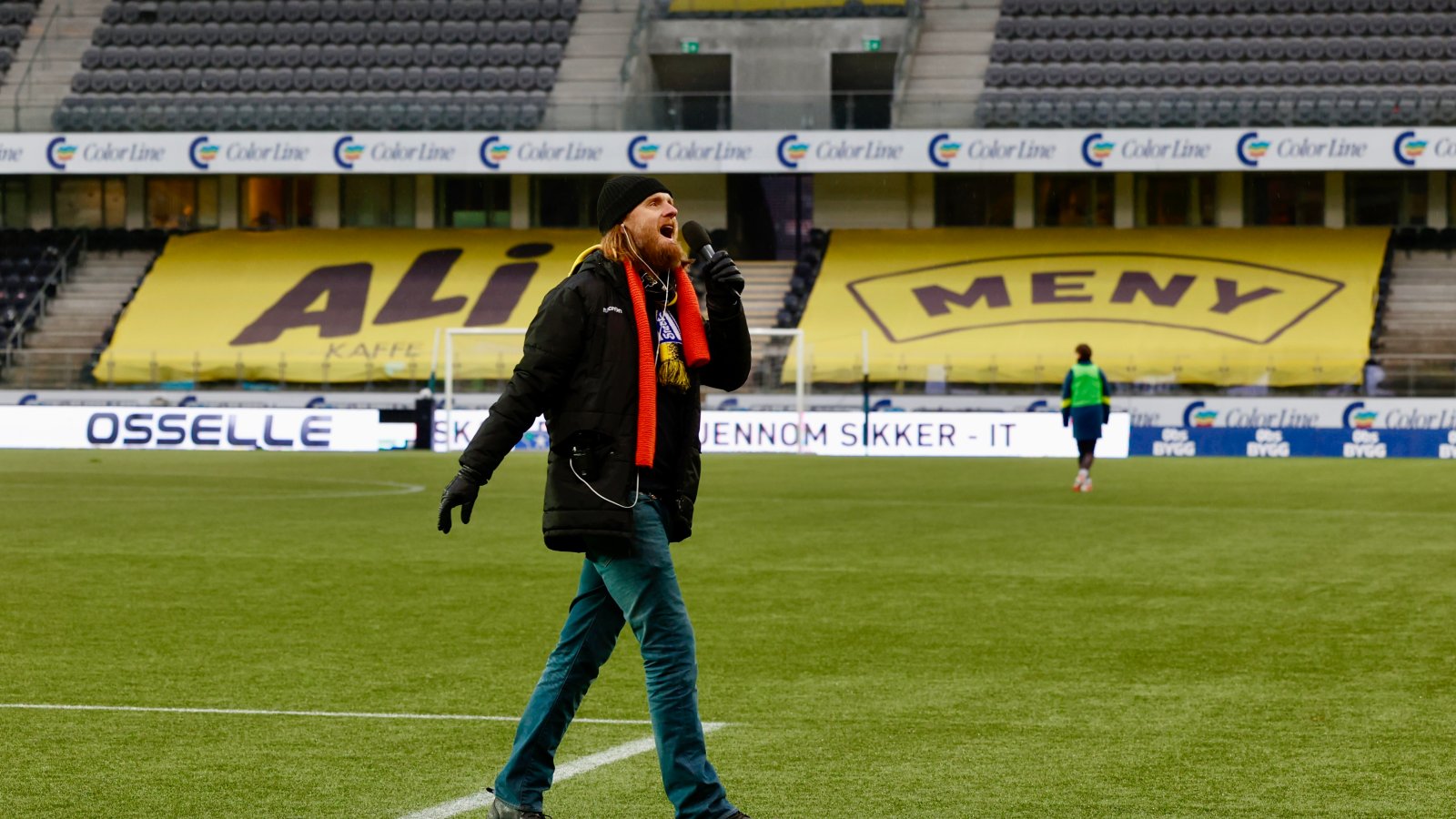 Her fremfører Erlend Ropstad sin nye Start-sang "Londsia" i pausen mot KFUM. (Foto: Tor Erik Schrøder)
