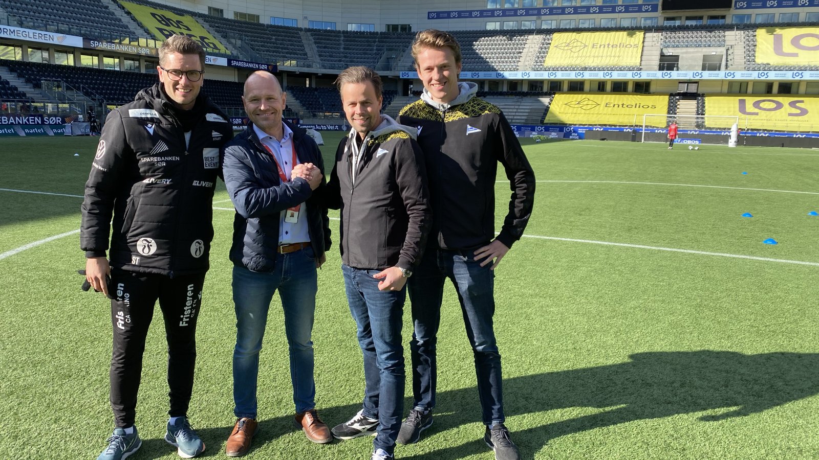 Sindre Tjelmeland (Starts hovedtrener - f.v.), Atle Hodne (regionsjef for Region Sør-Norge i Hennig-Olsen Is), Kristian Westgaard (salgssjef i Start) og Markus Slyngenborg Jensen (salgs- og markedsmedarbeider i Start) samlet på tirsdagens Start-trening på Sparebanken Sør Arena. (Foto: Egil Olsen). Partnere