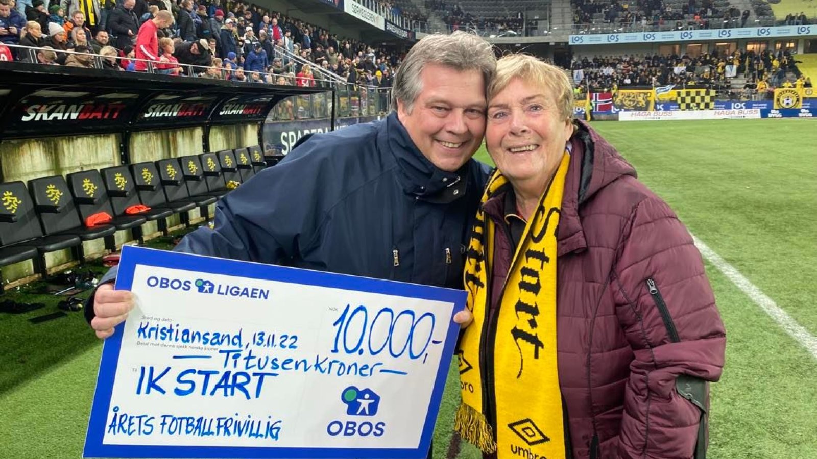 Eddie Thomas, sponsorrådgiver i OBOS, overrekker en sjekk på kr. 10.000 til Aud Karin Holberg, beviset på at hun er finalist i kampen om å bli «Årets fotballfrivillig». Hvis «Mor» får flest stemmer i finalen, vanker det enda en sjekk på Start, nå på kr. 50.000. (Foto: Egil Olsen).