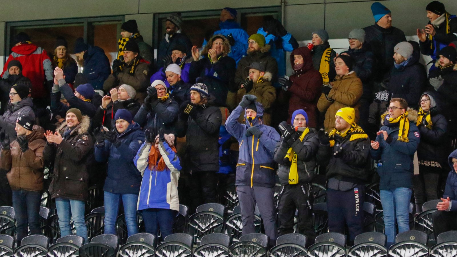 Publikum var godt fornøyd med 4-1-seieren over Tromsø den 11. mars 2018 på Sparebanken Sør Arena - til tross for kaldt vær og snø. (Foto: Tor Erik Schrøder / NTB)