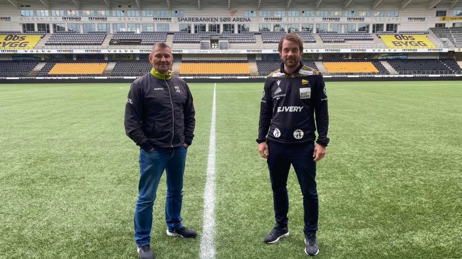 Knut Johnsen (t.v.), daglig leder i klatreparken Høyt & Lavt, har inngått samarbeidsavtale med Start, her representert ved Espen Børufsen, leder samfunnsansvar i klubben.