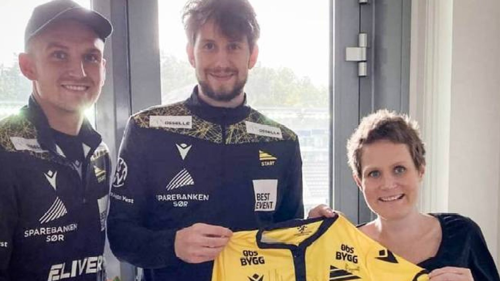 Vi i Start oppfordrer den store fotballfamilien til å bli med å hjelpe ildsjelen tilbake på banen. Bildet: Her er supporterkoordinator Line Duus sammen med Start-spillerne Kristoffer Valsvik (t.v) og Henrik Gjesdal.