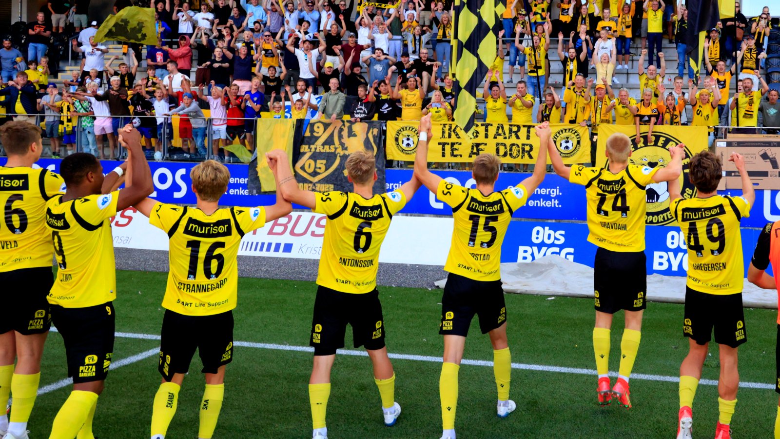 Slik så det ut forrige gang Bryne var på besøk på Sparebanken Sør Arena i OBOS-ligaen. Jærbuene ble sendt hjem på resultatet 6-0. Søndag går vi for å gjenskape jubelscenene fra kampslutt. (Foto: Tor Erik Schrøder)