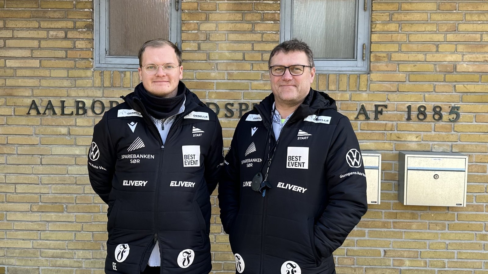 På Havlimyra Skole skole i Kristiansand var Arne Christian Ringsbu (t.h.) lærer for blant andre Eirik Moen Eskedal (t.v.). Nå er rollene byttet om, læreren er blitt elevens trenerassistent for Starts G17-lag. Her er de to fotografert på Aalborg Boldspilklubs anlegg på Nordjylland.