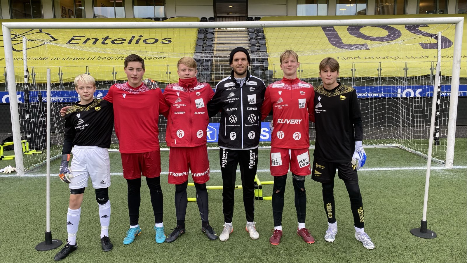 Mark Jensen sammen med fem av sine keeper-elever – f.v.: Jacob Seierstad Johnsen (Randesund), Jon Finsådal-Kristensen (Søgne), Eskil Emil Møllen (Start), Herman Seierstad Johnsen (Start) og Casper Eastwood (Våg). Dennis Birkenes (Søgne) var ikke tilstede da bildet ble tatt. (Foto: Egil Olsen)