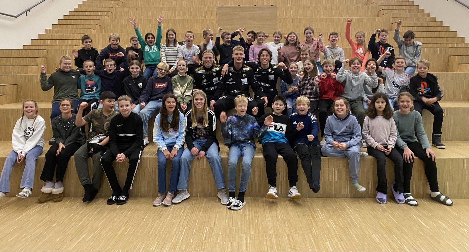 Start-spillerne Mathias Grundetjern (t.v.), August Frobenius og Sander Sjøkvist sammen med de engasjerte 6.-klassingene på Kringsjå skole i Randesund. Søndag kommer noen av dem på Sparebanken Sør Arena for å se kvalifiseringskampen mellom Start og Kongsvinger. (Foto: Egil Olsen).