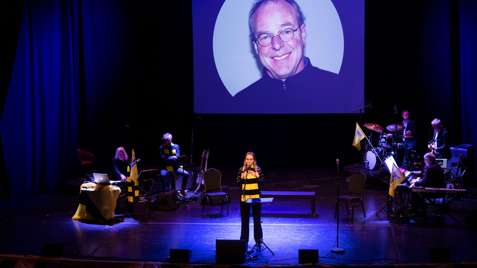 Det var helt stille i Teateret da Lillian Magrete Ringøen sang Asbjørn Arntsens nyskrevne sang om Svein Mathisen, «Matta i flomlysets minnebok…», på revyen «2x45» sist lørdag. På scenen er f.v.: Bjørn Ole Rasch (musikalsk leder), Rolf Kristensen (gitar), Jan Inge «Jango» Nilsen (trommer), Per Elias Drabløs (bass) og Asbjørn Arntsen (piano). Trond Tellefsen spilte keyboard, men er ikke på bildet. (Foto: Tor Erik Schrøder).