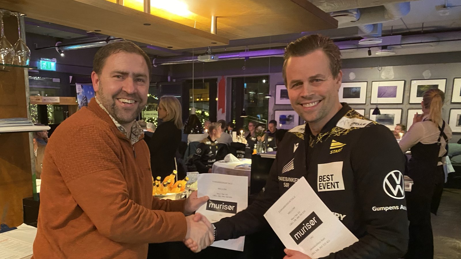 Salg- og markedssjef i Start, Kristian Westgaard (t.h.) er strålende fornøyd med at Mur i Sør, her representert ved daglig leder Tom Arne Aamodt, har forlenget samarbeidsavtalen med klubben i to år, med opsjon på to til. Her er de på restauranten Hos Moi på Fiskebrygga i Kristiansand, der avtalen ble signert tirsdag kveld. (Alle foto: Egil Olsen)