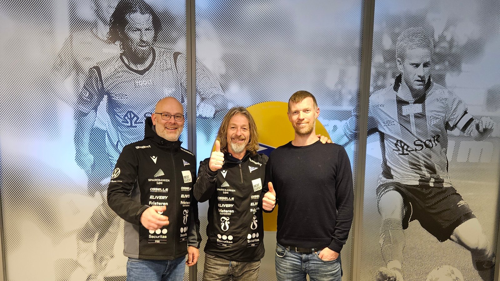 Erik Mykland er klar for et nytt år som spillerutvikler og hovedtrener for IK Starts G15-lag. Her står han med konstituert daglig leder, Sveinung Hedding-Valvik (t.v) og sine gode venn og tidligere Start-spiller Advokat Bernt Birkeland.