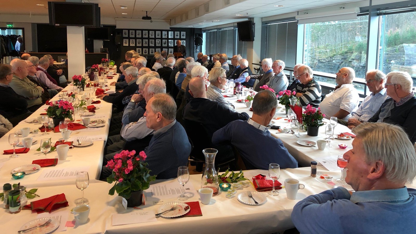 Oppskriften er den samme gode, gamle! 90 voksne menn, julegrøt, blaudis, utlodning, sang, taler og gaveoverlevering.