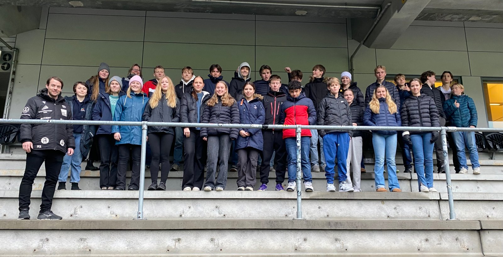 Klasse 9C på Oddemarka skole var fredag på besøk på Sparebanken Sør Arena – foran f.v.: Espen Børufsen (omviser og leder for samfunnsansvar i Start), Emma, Olea, Silje, Hedda, Linnea, Silje, Mina, Mads, Tayem, Jesper, Johanna, Julie og Mina. Foran f.v: Theodine, Laila Hoelstad (lærer), Arn, Jacob, Isak, Oliver, Marcus, Oliver, Theo, Margit, Børre, Nikolai, Philip, Alexander og Anders. (Foto: Egil Olsen)