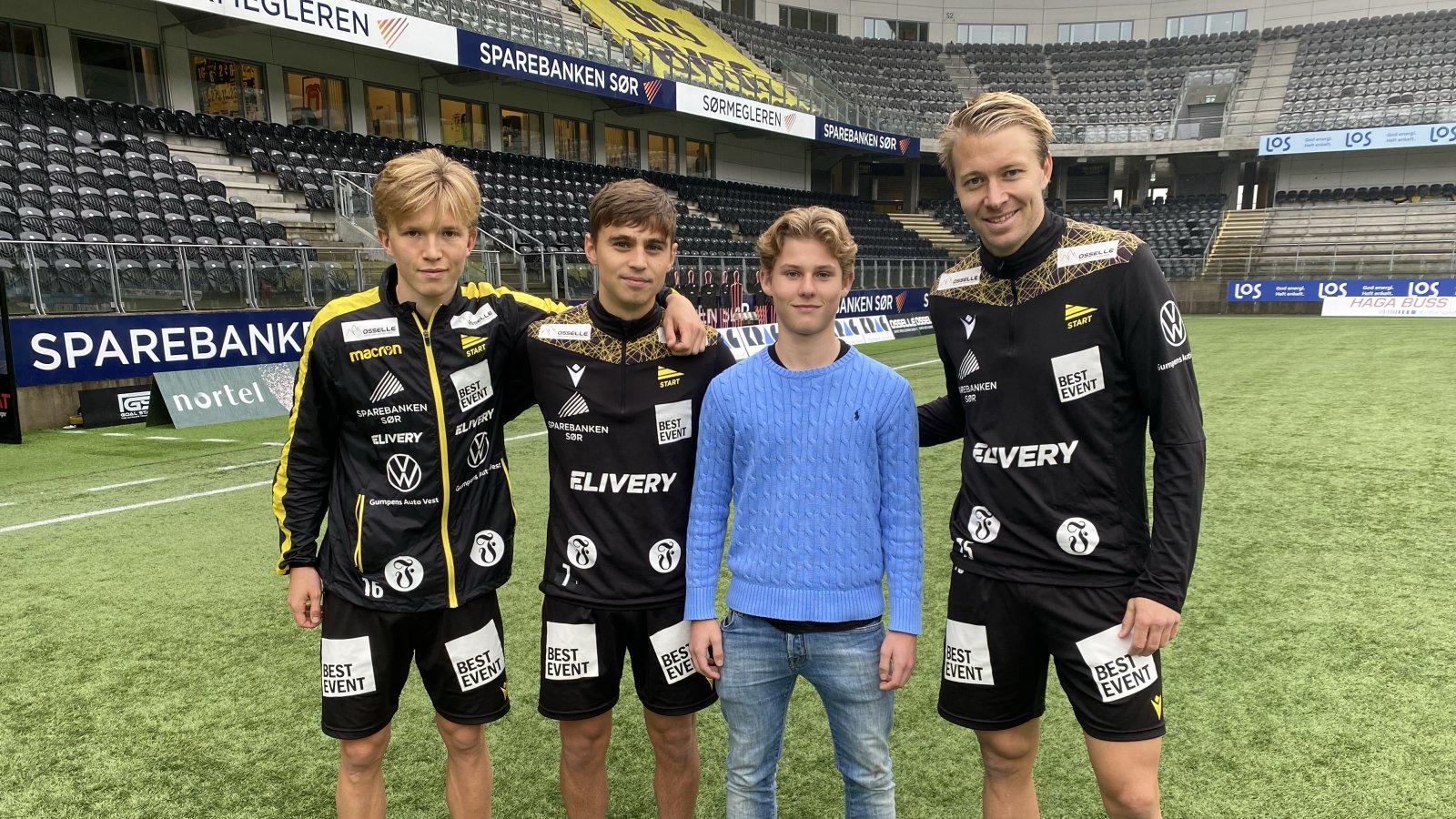 Frans Brunner hadde sist uke arbeidsuke på Sparebanken Sør Arena. Her er 14-åringen fra Oslo sammen med Start-spillerne Tom Strannegård (t.v.), Emir Derviskadic og Henrik Robstad. (Foto: Egil Olsen).