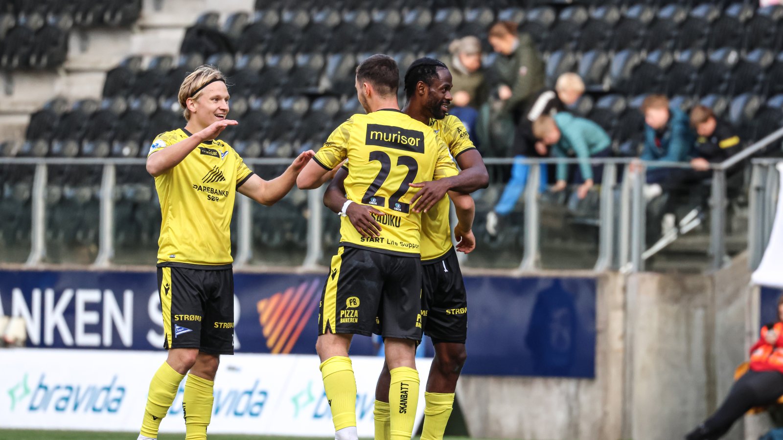 Lånespissen Agon Sadiku (med ryggen til) og høyrebacken Kalle Wallius (t.v.) er begge tatt ut til å spille landslagsfotball for Finland U21 under landslagspausen. (Foto: Svein Grundetjern)