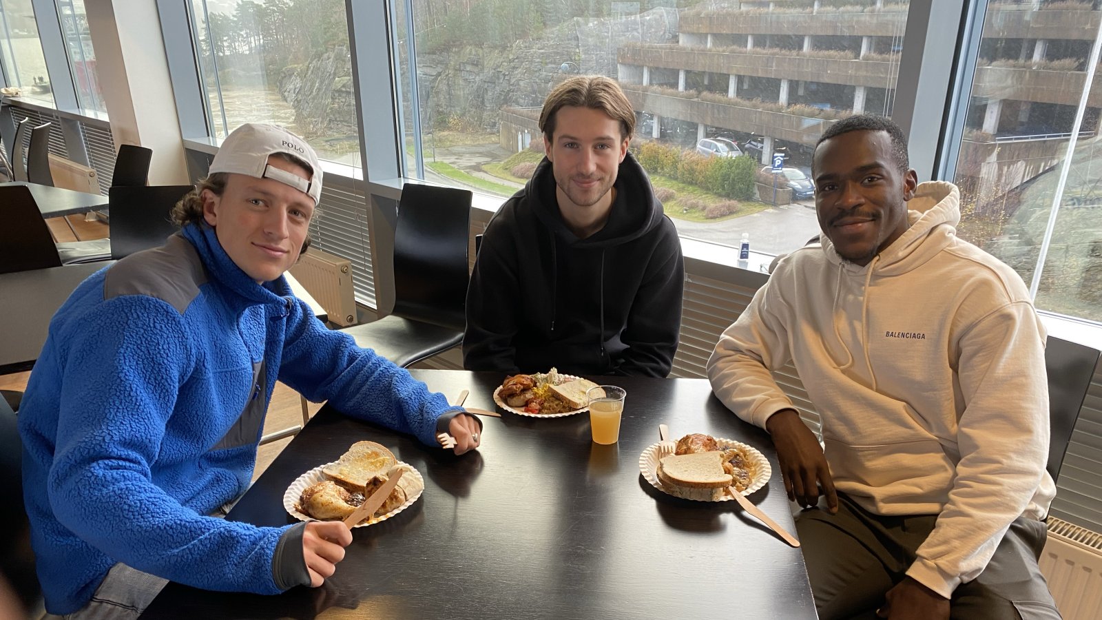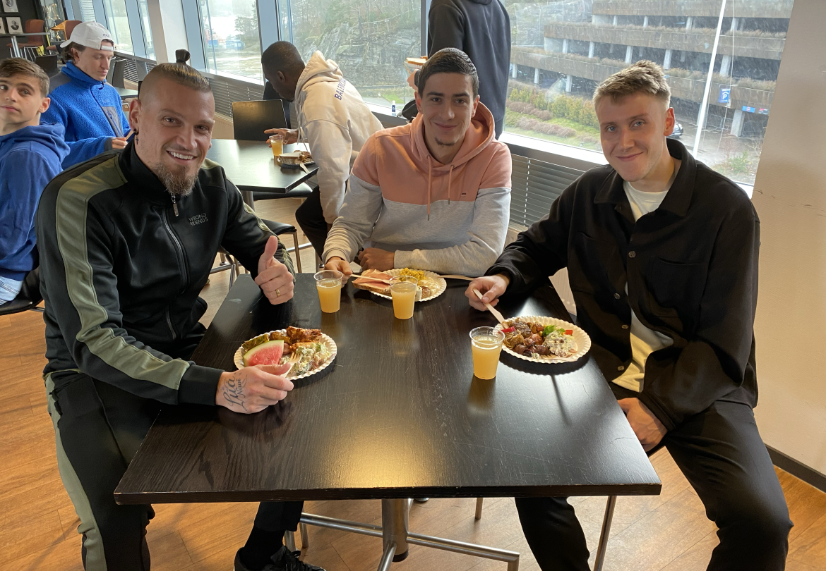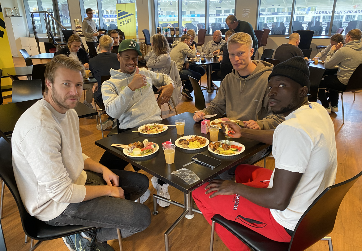 Sander Sjøkvist (f.v.), Cameron Cresswell og Basilio Ndong var blant spillerne som i dag deltok på Starts noe tidlige julelunsj i Klubbhuset på Sparebanken Sør Arena. (Alle foto: Egil Olsen).