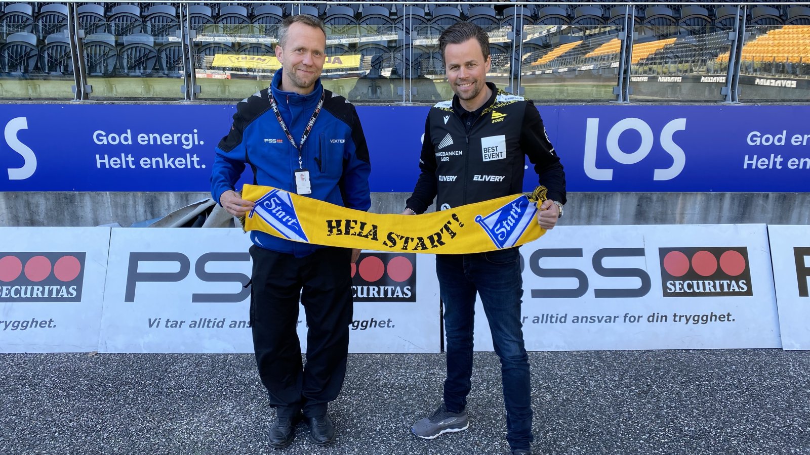 Starts salgssjef Kristian Westgaard (t.h.) setter pris på at PSS Securitas, her representert ved avdelingsleder Daniel Hauge, sørger for sikkerheten på Sparebanken Sør Arena også i 2022. (Foto: Egil Olsen).