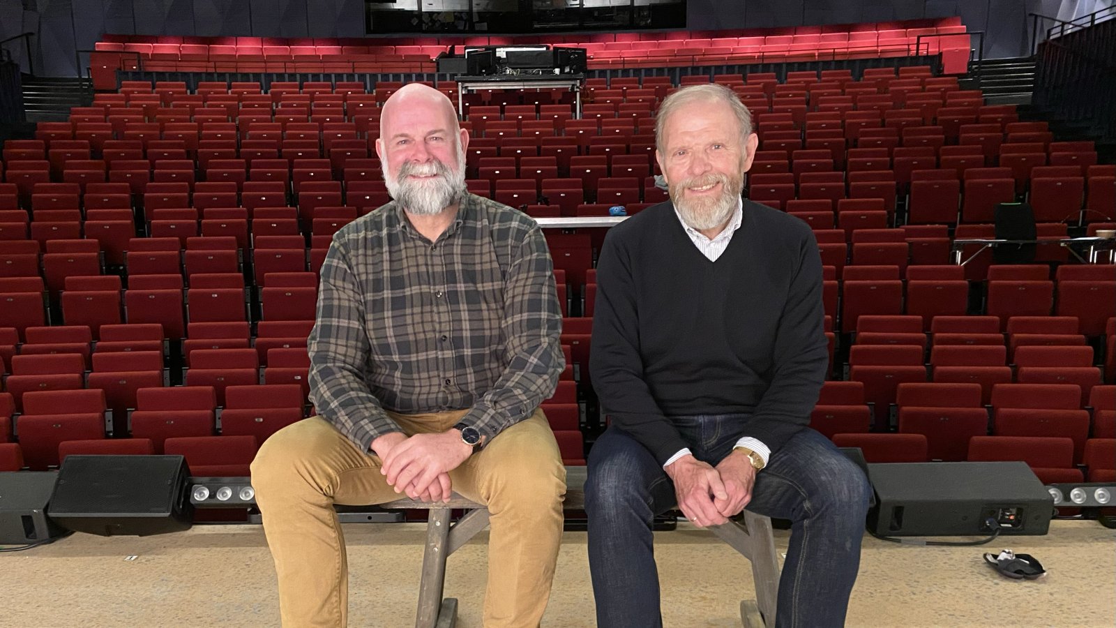 Start-legendene Trond Pedersen (71) og Paul Richardsen (61) på scenen i Kilden teater og konserthus, der de denne uken debuterer som profesjonelle skuespillere i Asbjørn Arntsens julemusikal «Like til Betlehem». (Foto: Egil Olsen).