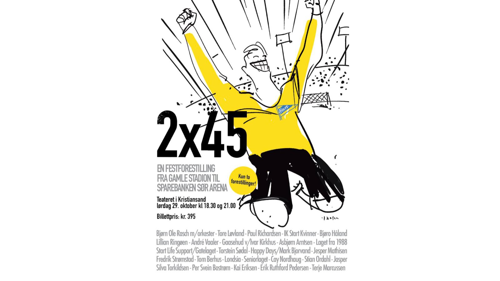 29. oktober, etter årets siste hjemmekamp, møtes vi på Teateret til oppsetningen 2 x 45. Bjøro Håland synger Start-fan, Jesper Mathisen/Fredrik Strømstad/Tom Berhus i fri dressur, Torstein Sødal, et fantastisk orkester, Asbjørn Arntsen har skrevet en helt ny sang, Gatelaget, A-laget danser, Londsia, spillere fra -88 laget, Gaasehud og mye, mye mer.