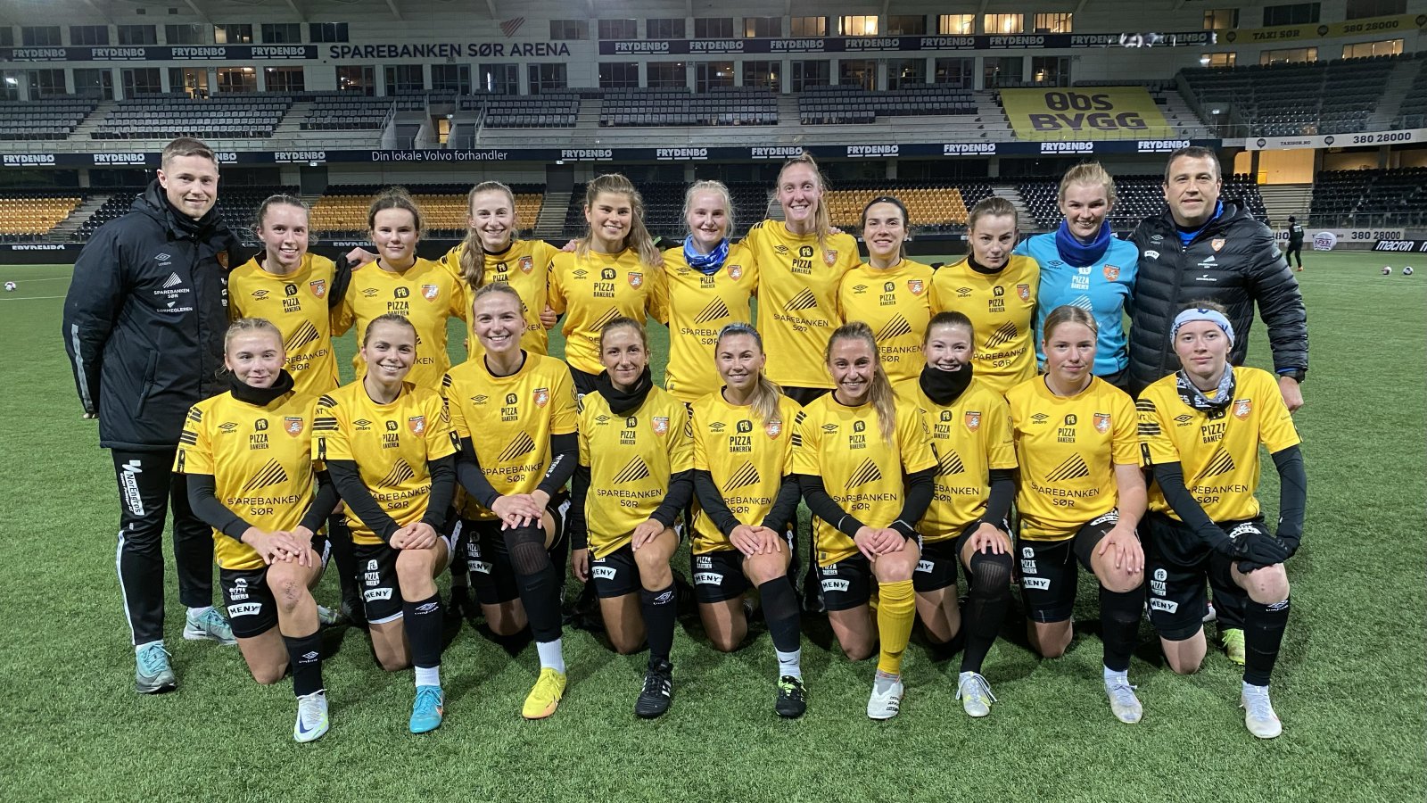 Gimletroll Kvinner A, som neste sesong blir Start Kvinner, på en av de siste treningene før søndagens kvalifiseringskamp om å beholde plassen i 2. divisjon, mot Sarpsborg 08 – bak f.v.: Sigurd Hagen (trener), Eirin Noem Korsvik, Sandra Eilertsen, Isabella Hayes Sundby (spillende trener), Rebecka Rosenberg, Frida Abrahamsen, Mette Lorentzen, Jana Lennartz, Frida Holmøy, Karen Olsen og Radoslaw Chmielwski (keepertrener). Foran f.v.: Ina Andresen, Maja Kronborg, Hannah Larsen, Marie Knutsen, Mia Olsen Leinan, Linn Farbergshagen, Karoline Fredriksen, Tiril Toft og Stine Wahlin Hansen. (Foto: Egil Olsen).