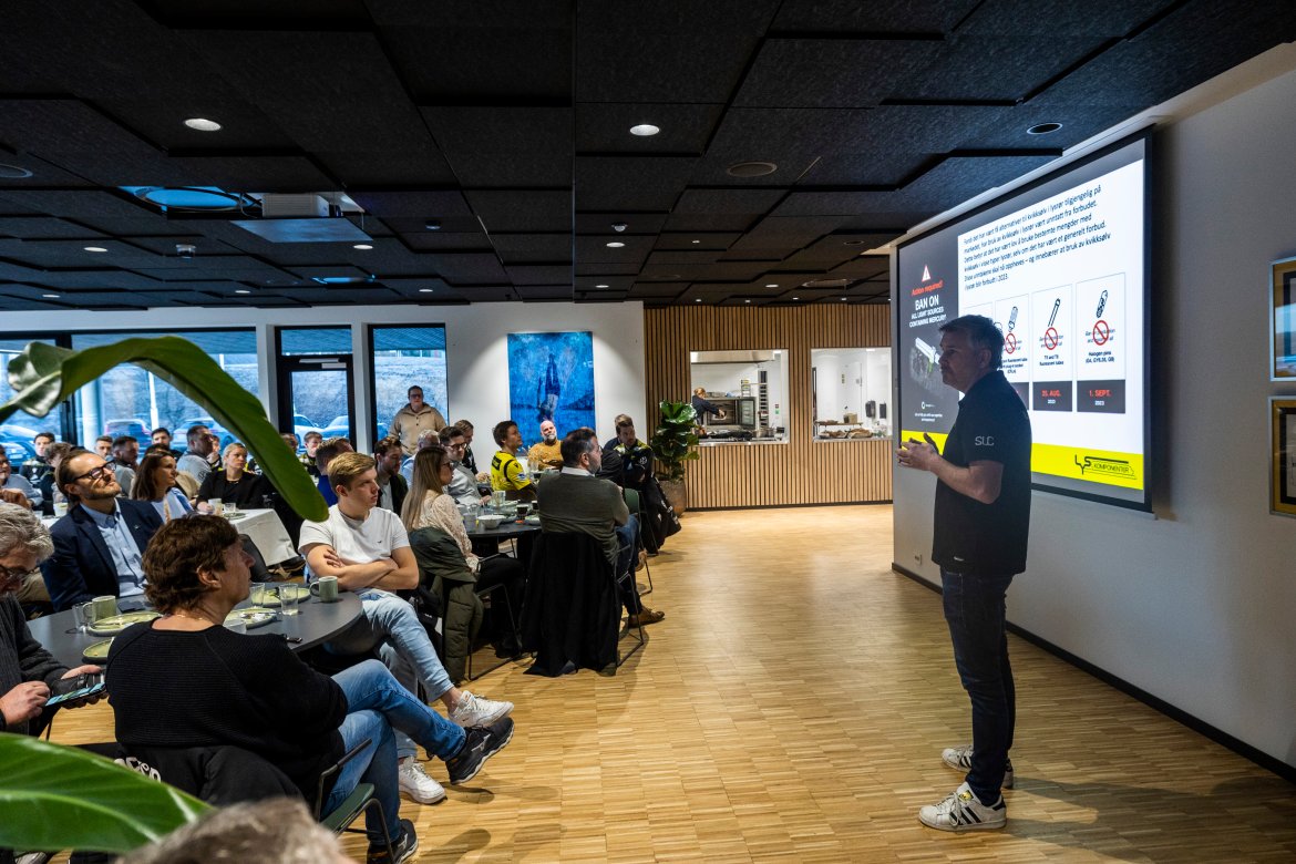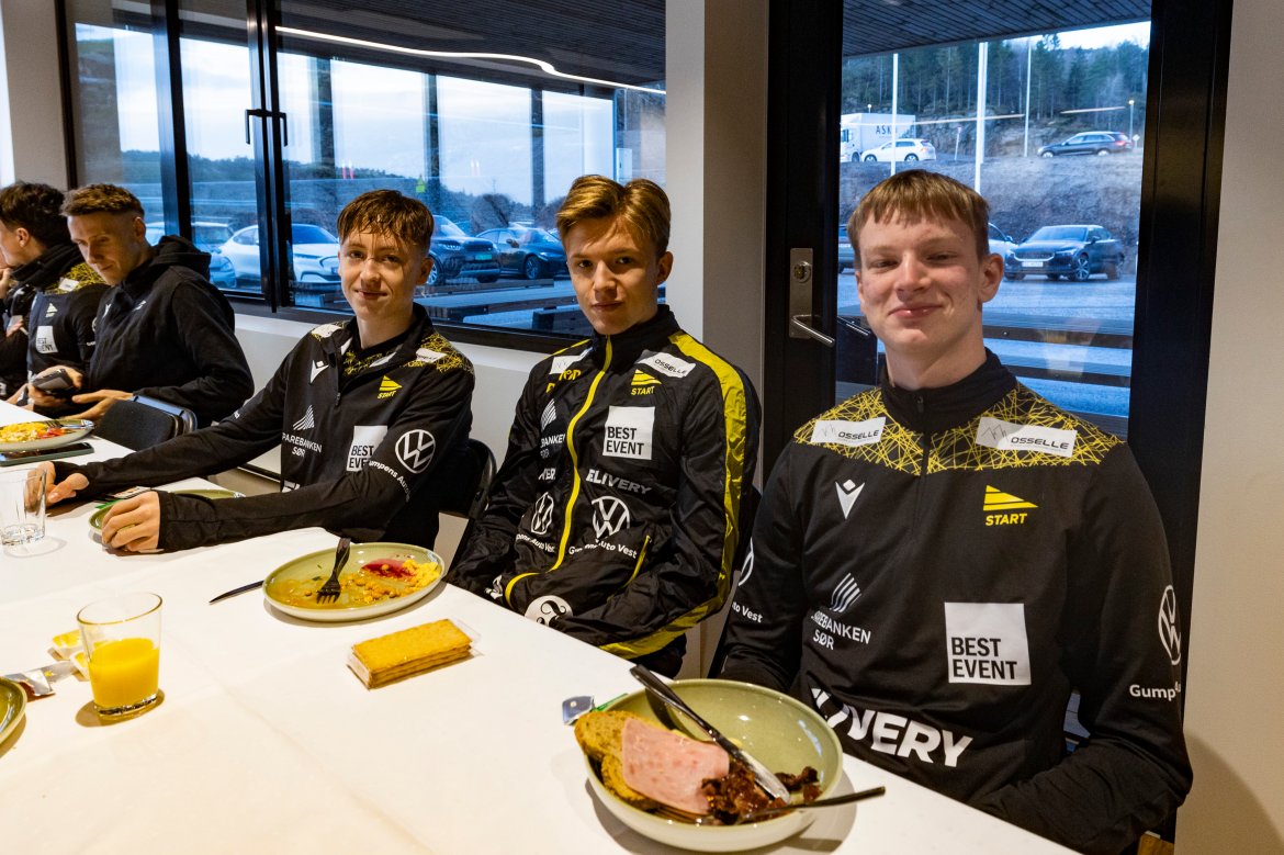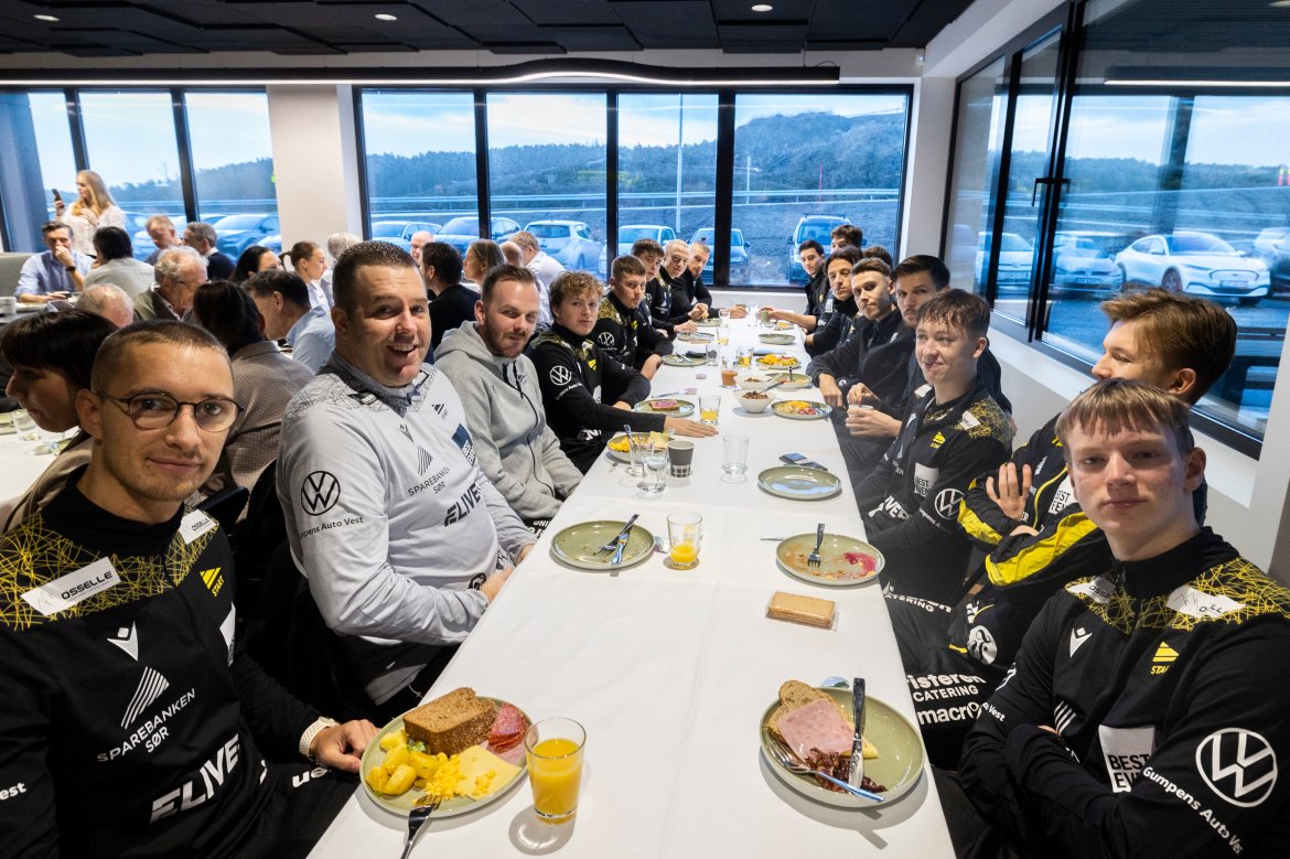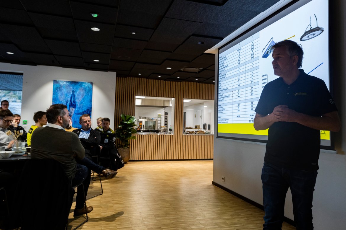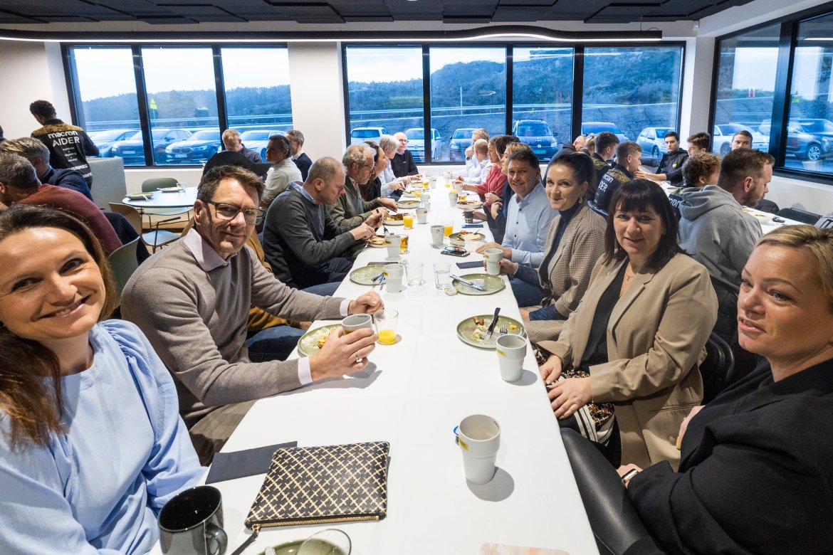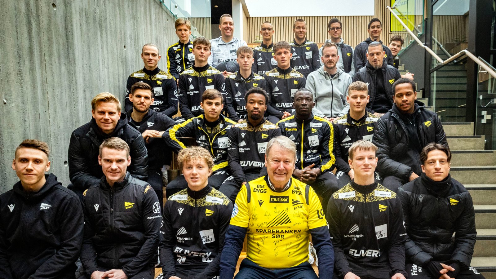 Den meritterte fotballprofilen Åge Hareide holdt torsdag foredrag for blant andre Starts spillere, trenere og støtteapparat på partnerfrokosten hos Lyskomponenter på Mjåvann industriområde – første rekke f.v.: Bjarni Mark Antonsson, Jon-Helge Tveita, Levi Eftevaag, Åge Hareide, Herman Seierstad Johnsen og Sander Sjøkvist. Andre rekke f.v.: Eirik Schulze, Mark Fabricius Jensen, Emir Derviskadic, Salim Nkubiri, Alagie Sanyang, Marius Nordal og Zakaria Sawo. Tredje rekke f.v.: Mathias Grundetjern, Sander Svela, Sander Richardsen, Jesper Gregersen, Endre Eide (assistenttrener) og Vito Wormgoor. Bakerste rekke f.v.: Tom Strannegård, Rune Hægeland (materialforvalter), Emil Grønn Pedersen, Henrik Robstad, Sindre Tjelmeland (hovedtrener), Luc Mares og Jasper Silva Torkildsen. (Foto: Tor Erik Schrøder)