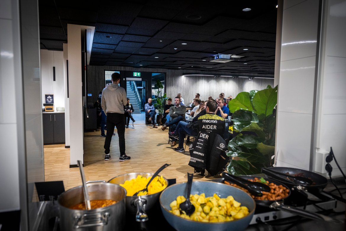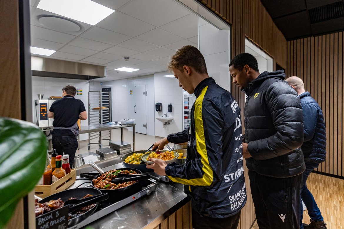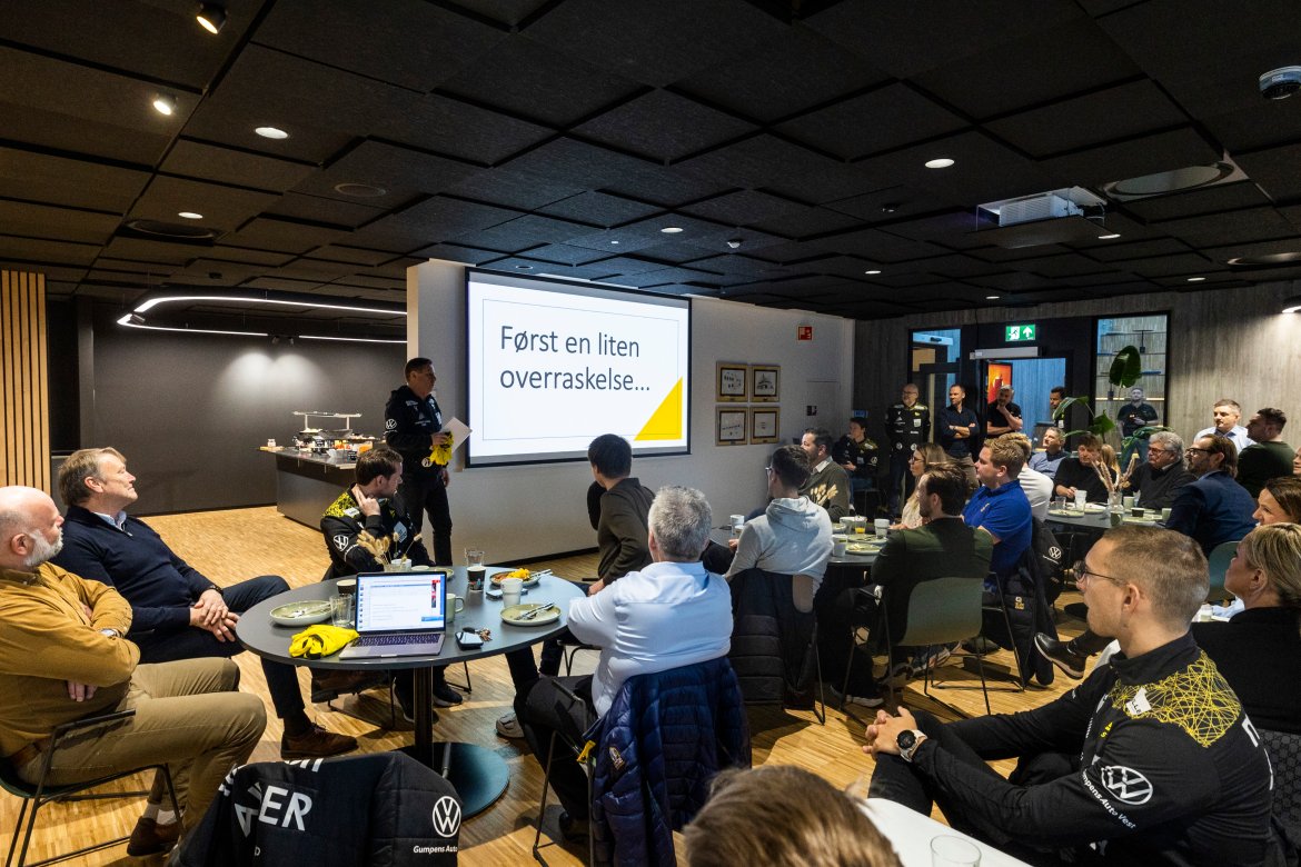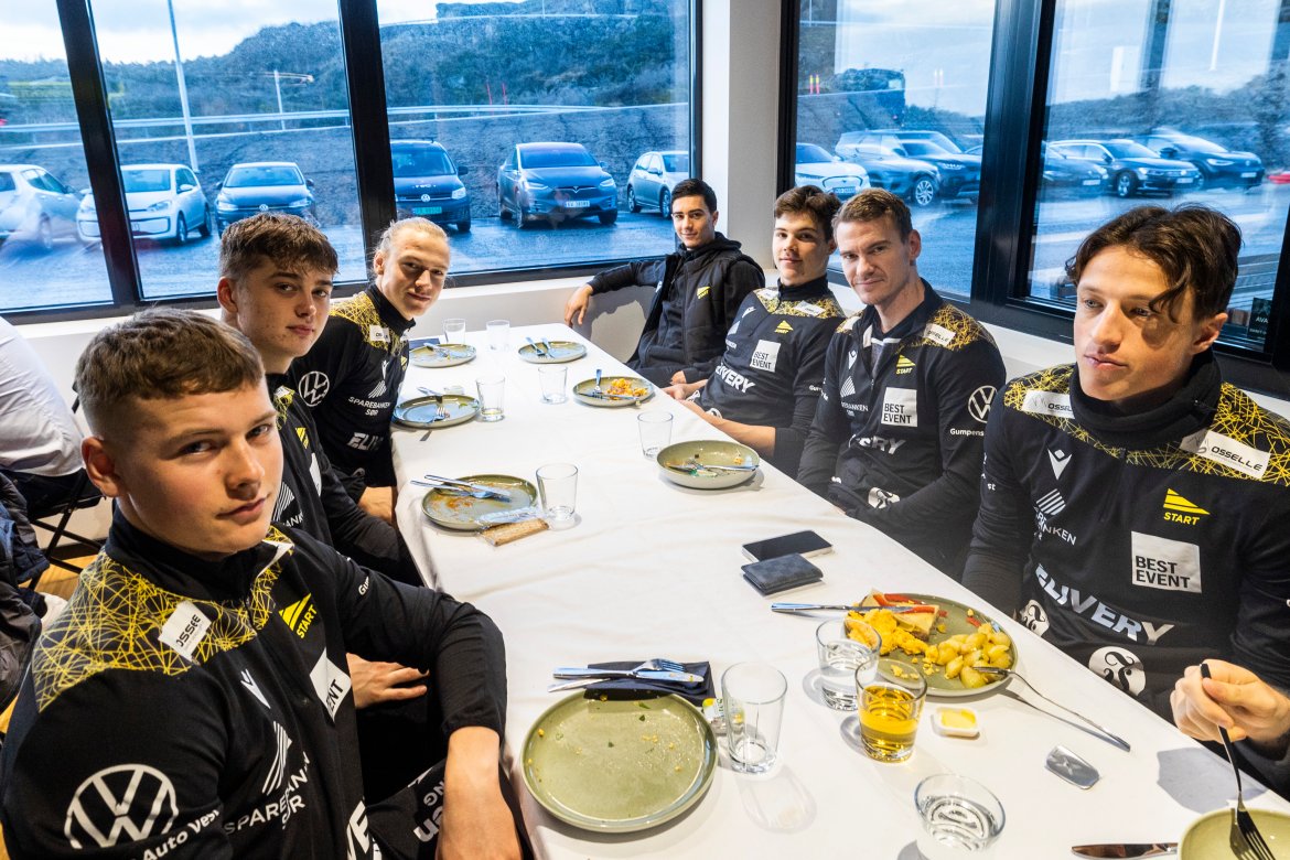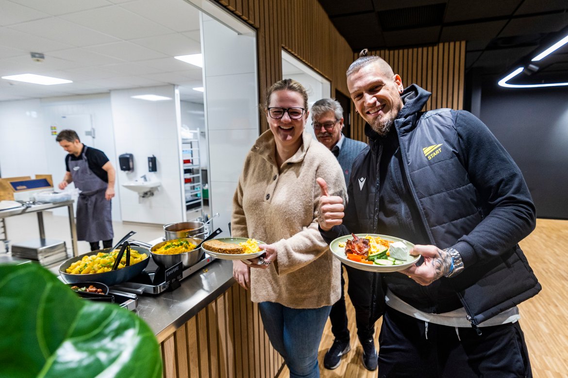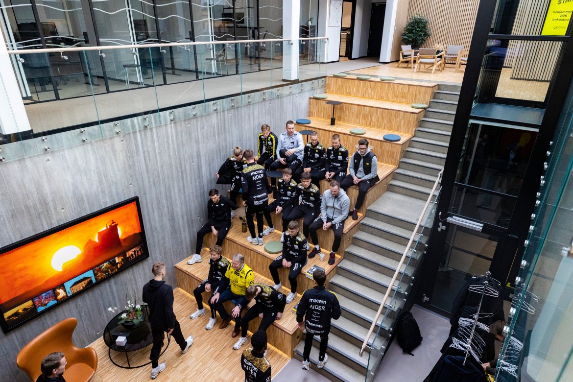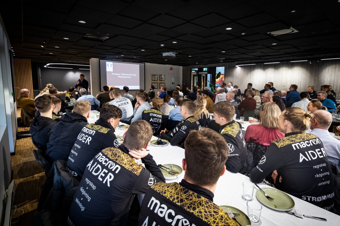 Den meritterte fotballprofilen Åge Hareide holdt torsdag foredrag for blant andre Starts spillere, trenere og støtteapparat på partnerfrokosten hos Lyskomponenter på Mjåvann industriområde – første rekke f.v.: Bjarni Mark Antonsson, Jon-Helge Tveita, Levi Eftevaag, Åge Hareide, Herman Seierstad Johnsen og Sander Sjøkvist. Andre rekke f.v.: Eirik Schulze, Mark Fabricius Jensen, Emir Derviskadic, Salim Nkubiri, Alagie Sanyang, Marius Nordal og Zakaria Sawo. Tredje rekke f.v.: Mathias Grundetjern, Sander Svela, Sander Richardsen, Jesper Gregersen, Endre Eide (assistenttrener) og Vito Wormgoor. Bakerste rekke f.v.: Tom Strannegård, Rune Hægeland (materialforvalter), Emil Grønn Pedersen, Henrik Robstad, Sindre Tjelmeland (hovedtrener), Luc Mares og Jasper Silva Torkildsen. (Foto: Tor Erik Schrøder)