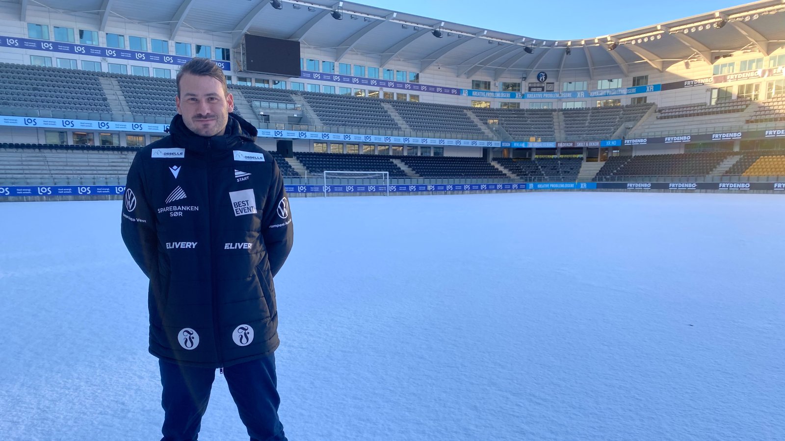 Simen Moe fotografert på en snødekt Sparebanken Sør Arena, hvor 32-åringen skal trene Starts G19-gutter, det vil også si Start 2, sammen med Thomas Ferreira. Han begynner i jobben første uken på nyåret. (Foto: Egil Olsen).