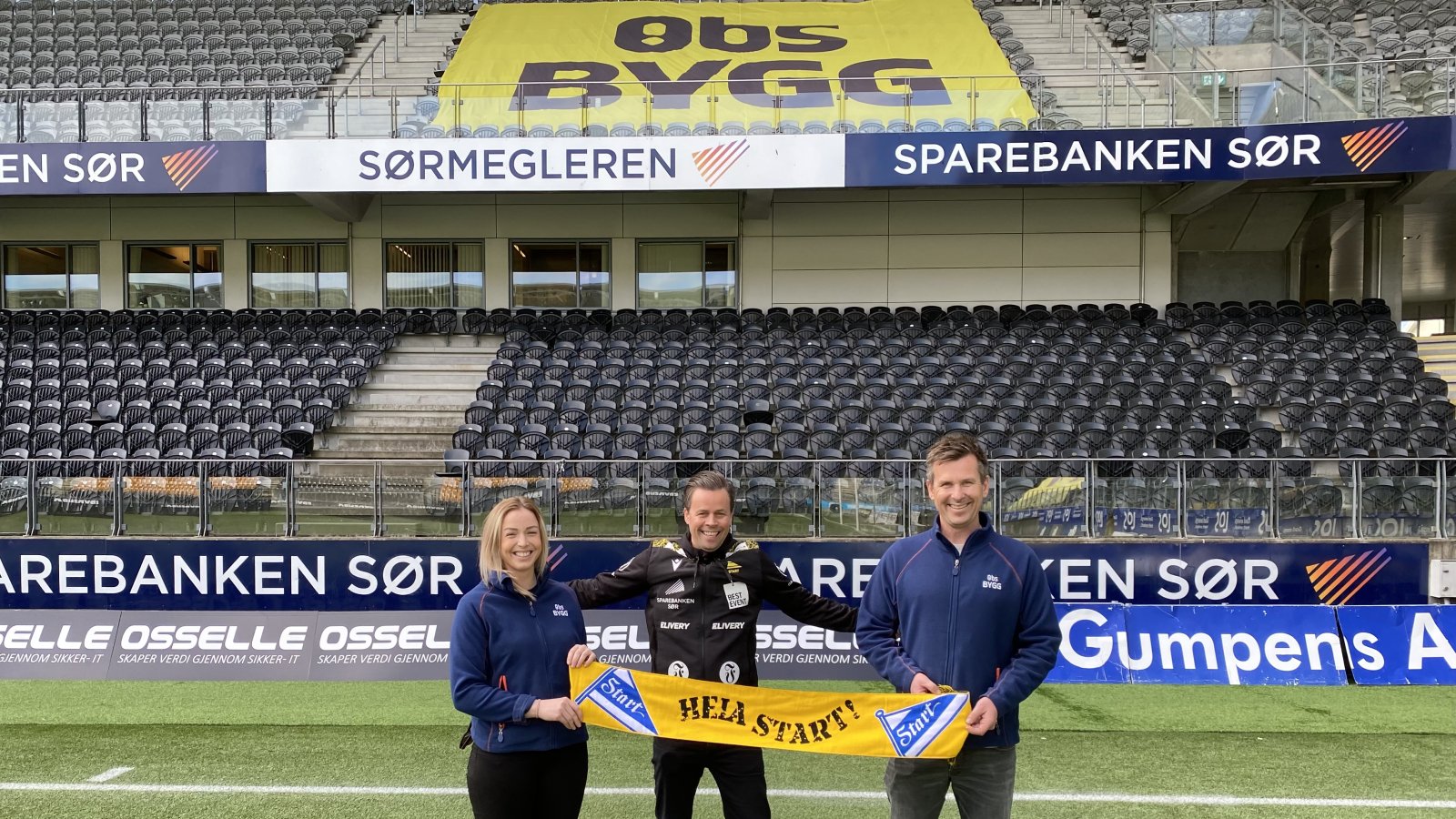 Starts salgssjef, Kristian Westgaard (i midten), setter stor pris på at Obs Bygg Sørlandsparken, her representert ved Maja Hystad, avdelingsleder butikk, og varehussjef Kenneth Gorman, er samarbeidspartner til klubben. (Foto: Egil Olsen). Partnere