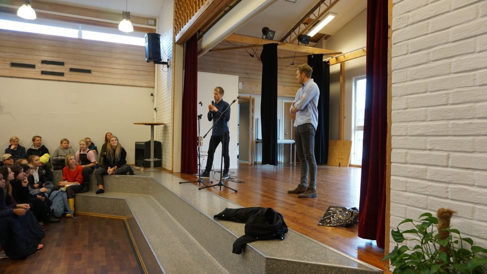 Henrik Robstad og Daniel Aase brukte en av sine første feriedager i møte med en fin gjeng på Møvig skole. Fokus var å snakke om mobbing.