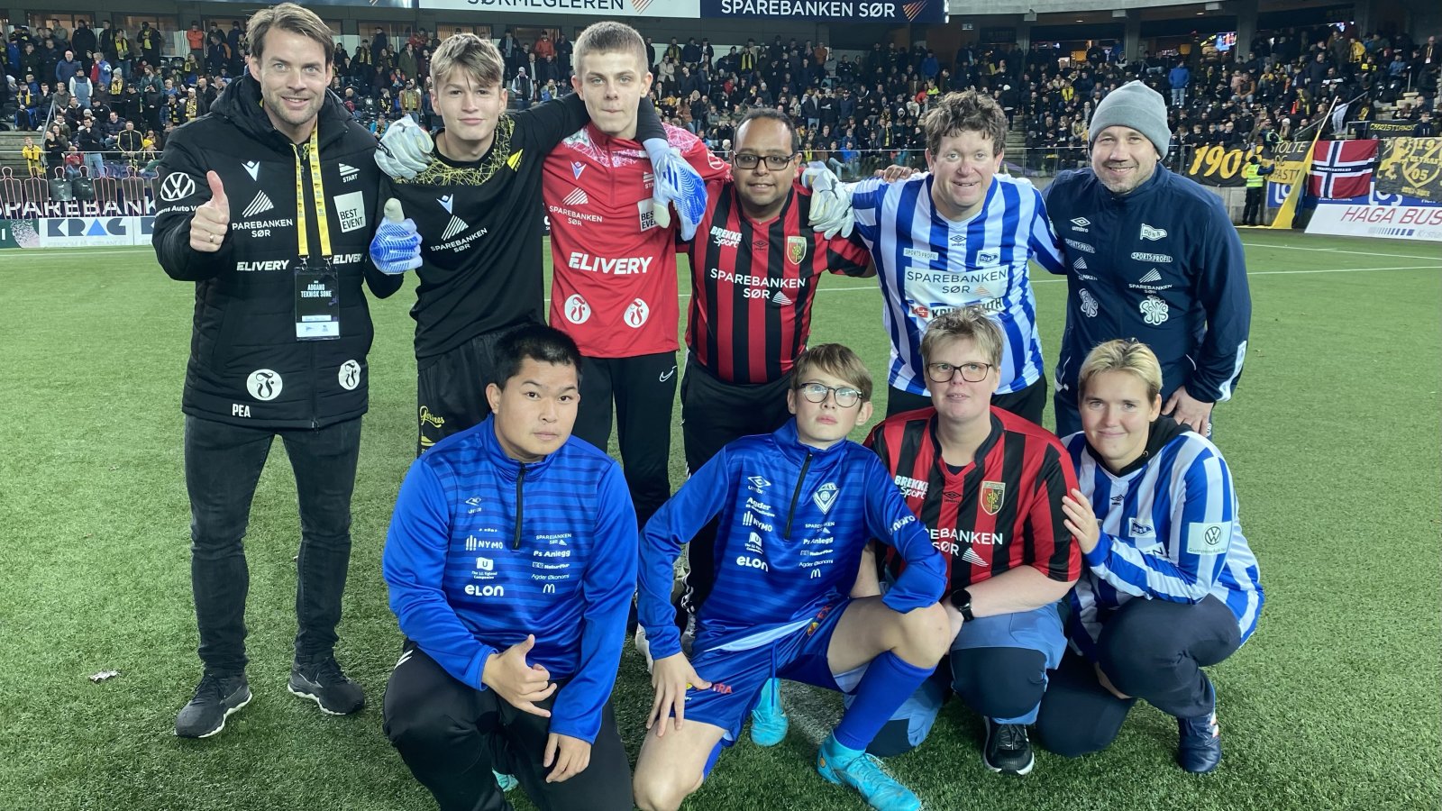 Espen Børufsen, leder for samfunnsansvar i Start (bak f.v.) og keeperne Casper Eastwood (Våg) og Dennis Birkenes (Søgne), som begge hospiterer i Starts ungdomsavdeling, sammen med spillerne fra Donns, Øyestads og Imås sitt Stjernelag: Christoffer (Øyestad), Kjetil (Donn) og Nikolai Novak (Donn, trener). Foran f.v.: Poe Hser (Imås), Ole Einar (Imås), Trine Lise (Øyestad) og Benedikte (Donn). (Foto: Egil Olsen).