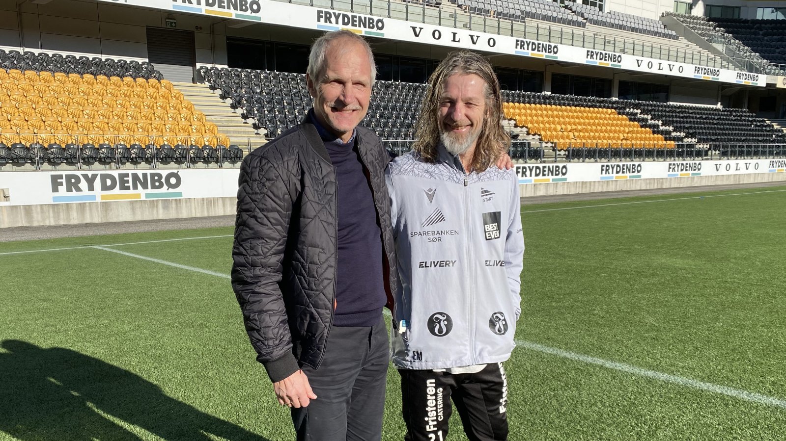 Første gang Hallvar Thoresen (t.v.) og Erik Mykland møtte hverandre var på førstnevntes fotballskole i Larvik i 1982. Torsdag møttes de to fotball-legendene igjen på Sparebanken Sør Arena.