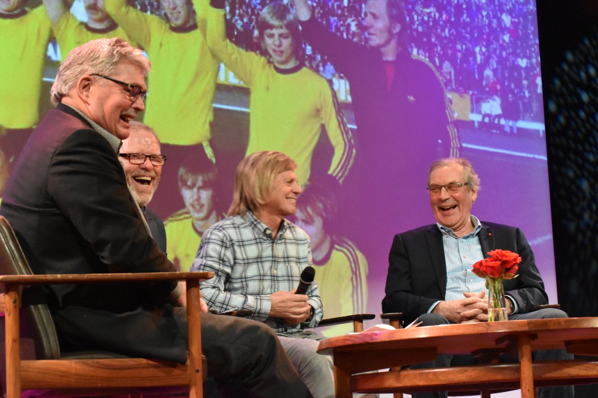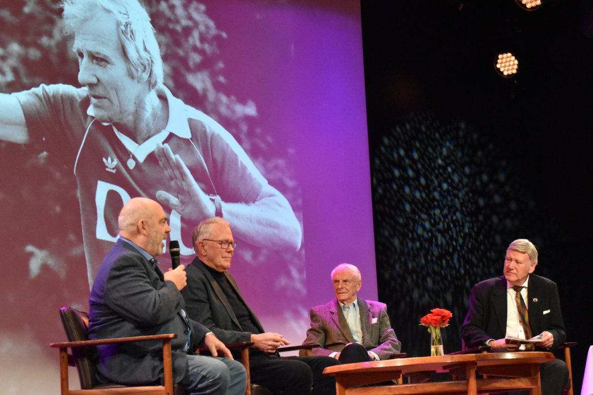 Deretter kom spillerne Trond Pedersen og Preben Jørgensen (fra 70- og 80-tallet), samt Karstens assistenttrener Helge Henriksen og mangeårig materialforvalter i Start, Kai Eriksen, på scenen.