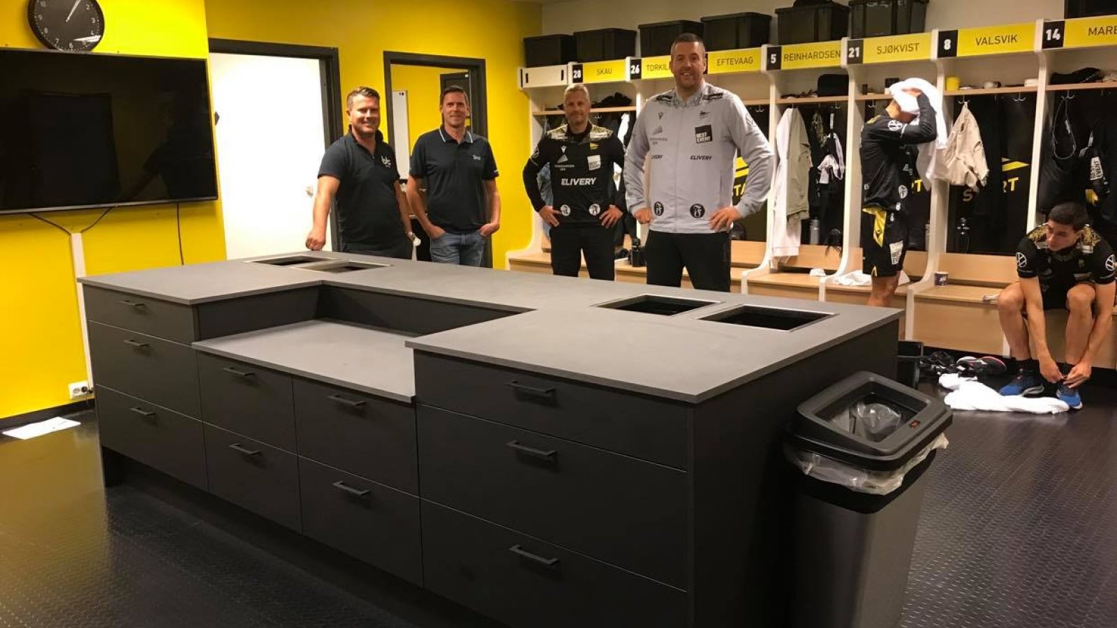 F.v.: Tønnes Sindland (daglig leder i Byggmester Tønnes), Andre Berg (salgssjef i Strai Kjøkken), Arne Simonsen (markedssjef i Start) og Rune Hægeland (materialforvalter i Start) bak den nye øya i hjemmegarderoben på Sparebanken Sør Arena.