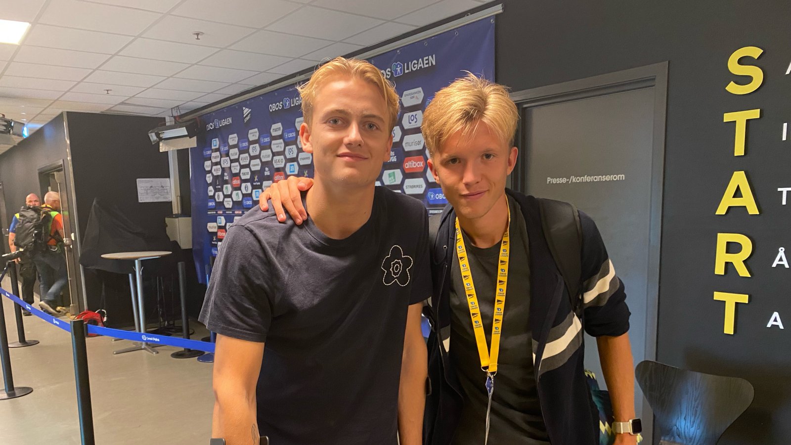 Tom Strannegård (t.h.) sammen med Oskar Fallenius på Sparebanken Sør Arena etter gårsdagens kamp mot Sandnes Ulf. I kveld spiller Starts nyervervelse fra AIK sin første kamp, når Start møter Vindbjart på Moseidmoen. (Foto: Egil Olsen).