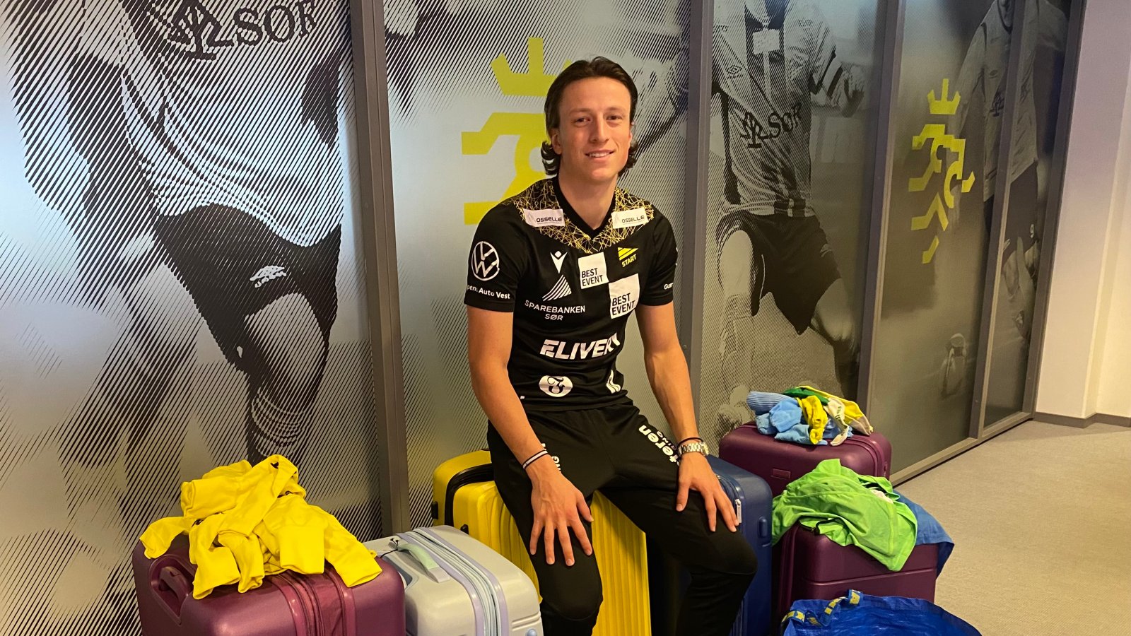 Her sitter Sander Sjøkvist på et «kaos» av kofferter og poser fulle av fotballutstyr. Neste stopp for Start-spilleren og innholdet er Start Life Supports fotballprosjekt i Dar es Salaam i Tanzania. (Foto: Egil Olsen)
