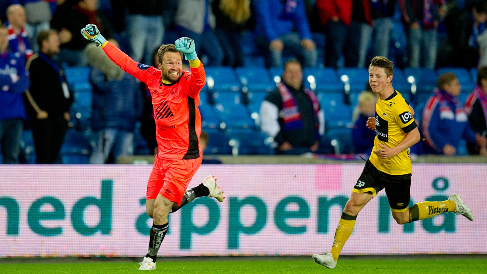 Håkon Opdal jubler vilt etter å ha scoret fra midtbanen på Ullevaal mot Vålerenga i 2015. Målet skulle vise seg å bli veldig viktig i kampen for å unngå nedrykk. Til høyre: Mathias Rasmussen