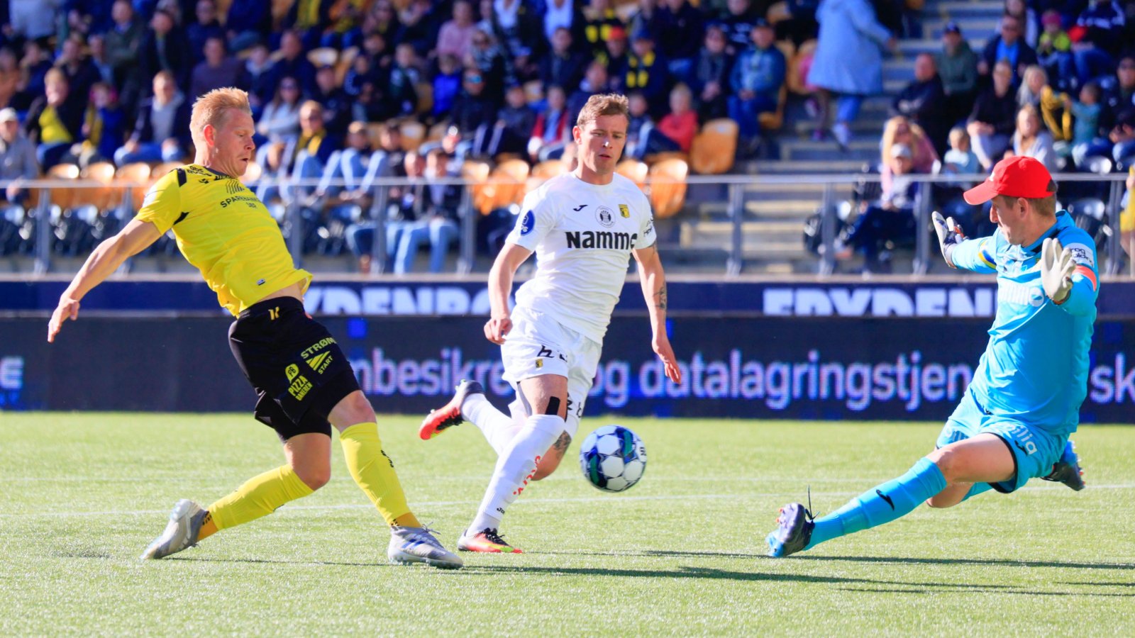 6 min: Raufoss angriper på venstrekanten og lurer Start-forsvaret, inne foran må venter Gard Simenstad og sender bortelaget i ledelsen.