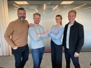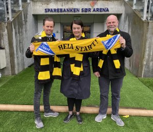 Starts salgssjef, Kristian Westgaard (t.v.), er strålende fornøyd med at Sparebanken Sør, her representert ved Eva Kvelland, Direktør marked og kommunikasjon og Paul Richardsen, markedssjef, har forlenget hovedsponsoravtalen med klubben. (Foto: Egil Olsen).