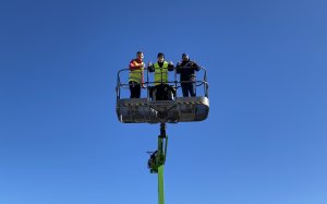 Dette bildet lyver. Cameron Cresswell holder tommelen opp. Men han er ikke veldig høy i hatten der han «svever» 28 meter over bakken. Med seg i liften har han keeper Mark Fabricius Jensen og Kim Utsogn fra Høyde Teknikk. (Alle foto: Egil Olsen).
